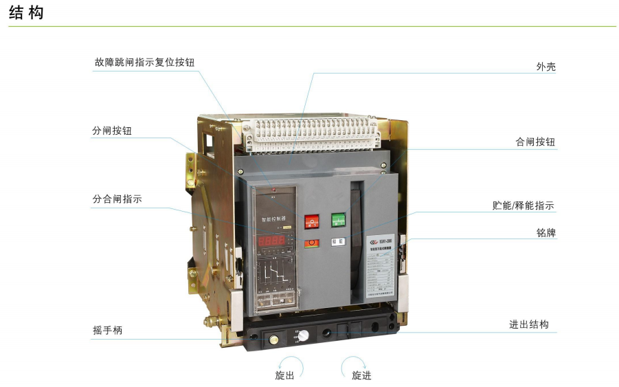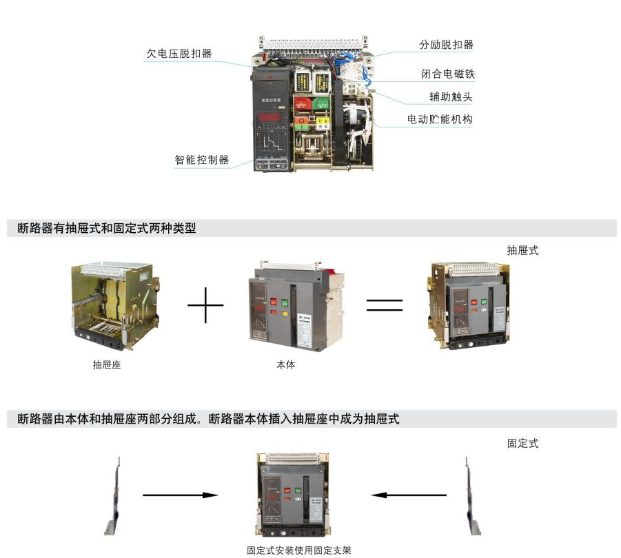 2、將斷路器(固定式)或抽屜座(抽屜式)放在安裝支架上,并緊固著,將主回路母線直接連接到固定式斷路器母線上,或在斷路器本體放入抽屜座導(dǎo)軌上,將手柄插入進(jìn)出裝置孔中,順時(shí)針轉(zhuǎn)動(dòng)手柄,使抽屜座下部位置指在連接位置時(shí),并聽到“咔嗒"聲后,表明斷路器本體連接到位,再將主回路母線連接到抽屜座母線上。