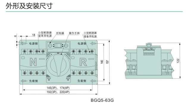 BGQ5-63自動(dòng)轉(zhuǎn)換開(kāi)關(guān)電器是由小型斷路器(DZ47-63)單機(jī)操作機(jī)構(gòu)、控制回路等組成,所有的元器件安裝在同一塊底板上。自動(dòng)轉(zhuǎn)換開(kāi)關(guān)電器的控制電源電壓為AC230V、機(jī)械壽命為5000次。